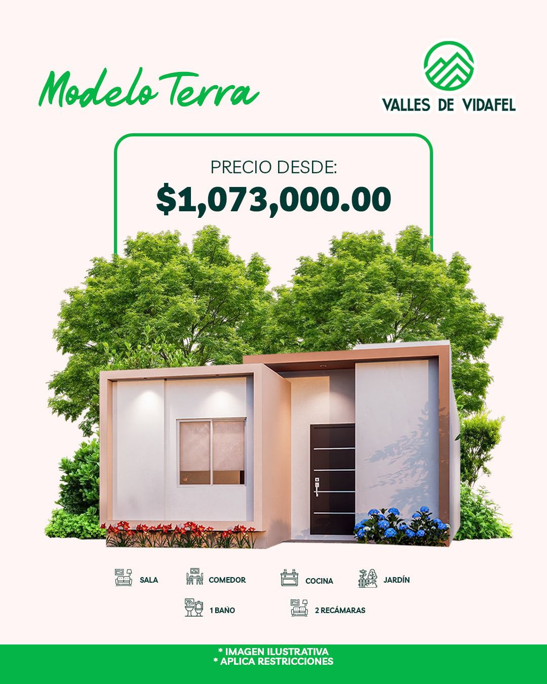 El Modelo Terra de Valles de Vidafel es una propiedad diseñada con un enfoque moderno y funcional. La casa incluye dos recámaras y un baño completo, siendo ideal para familias pequeñas. En cuanto a las áreas de convivencia y servicio, la distribución interior contempla los espacios esenciales para una Sala, un Comedor y una Cocina. Adicionalmente, la propiedad cuenta con un área de Jardín.