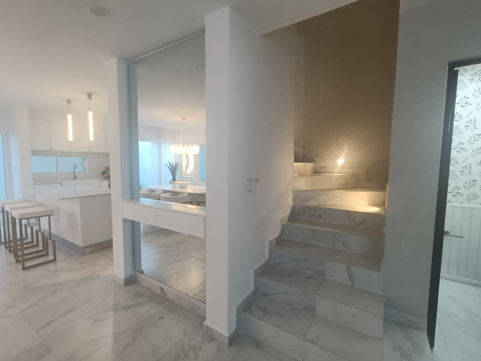 Diseño Luminoso: La escalera, a menudo realzada con luces empotradas, no solo es funcional sino un punto focal de diseño interior.